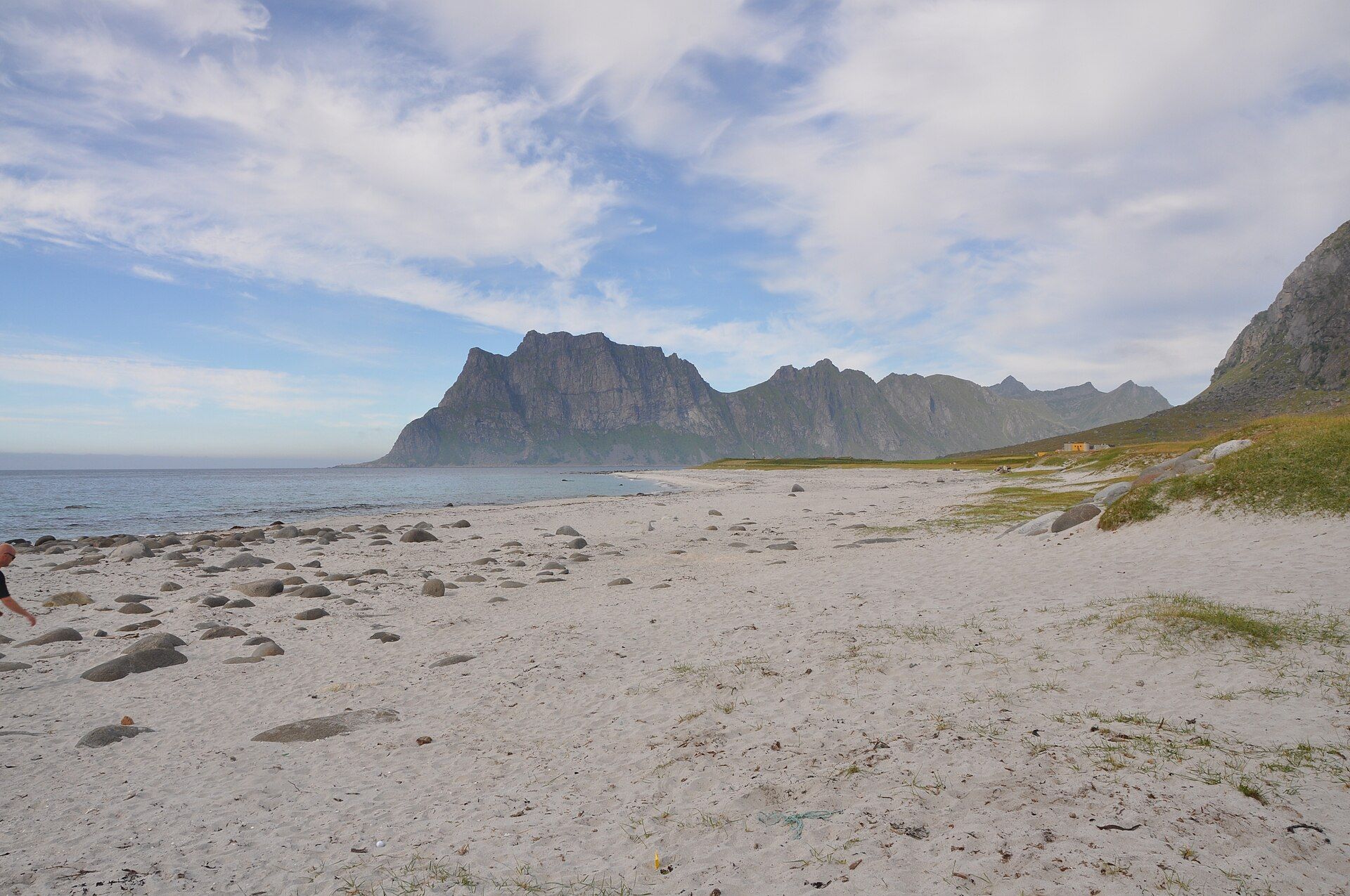 One of Lofoten's most immediately recognizable beaches. In winter the draw is not swimming but the contrast of pale sand, steel-blue water, snow lines, and a wide open bay that announces your arrival into the archipelago.